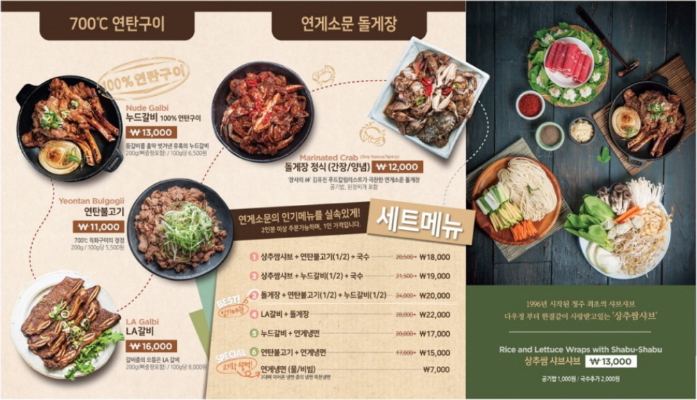 청주 연게소문의 연탄등갈비 가격은 100g기준 13,000원 입니다. 이외에도 연탄불고기 돌게장 정식 등이 있습니다. 자세한 가격은 사진을 참고해주세요.